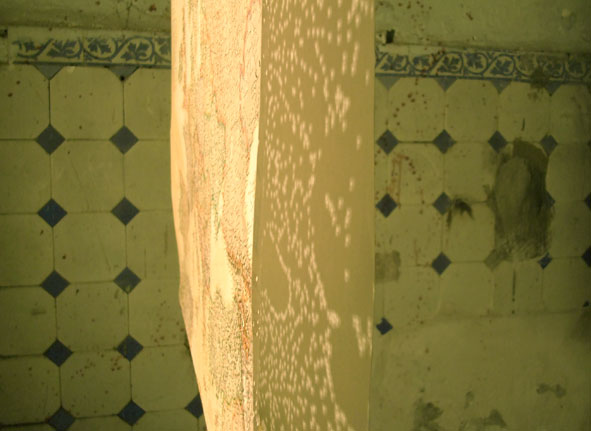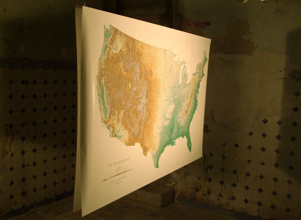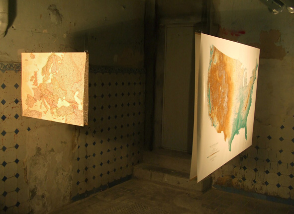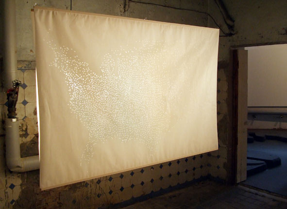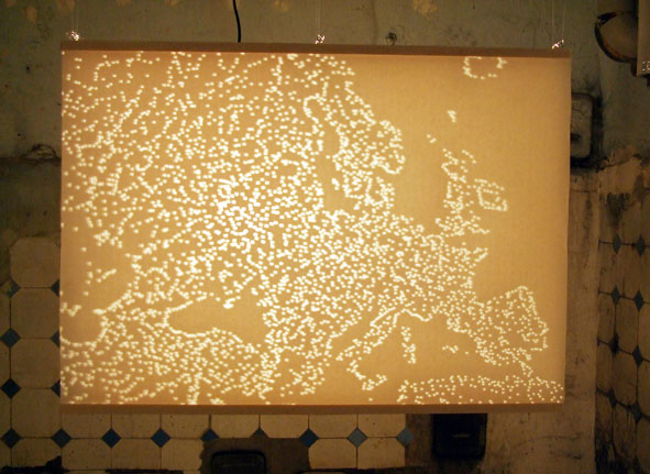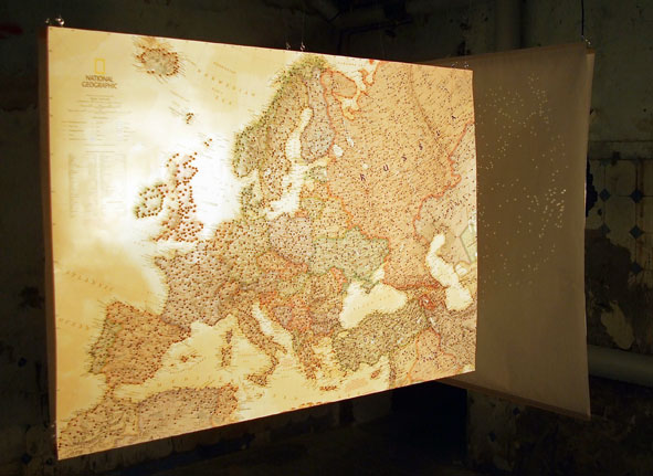 Aus zwei Landkarten ( Europa 50 - 70 cm / USA 145 - 90 cm ) sind alle Städtepunkte rund ausgestanzt. Die Landkarten hängen frei im Raum und werden mit Strahlern als einzige Lichtquelle beleuchtet. Durch die gelochten Landkarten fallen Lichtpunkte auf eine zweite Papierebene, die direkt hinter den Landkarten, auch frei im Raum schwebend, gehängt sind. Auf dem hinteren Papier sind nur die Lichtpunkte zu sehen, die sich in Schärfe und Kontrast verändern, wenn sich der Betrachter durch den Raum bewegt und so einen kleinen Luftstrom erzeugt