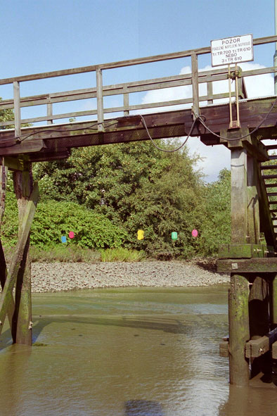 Verschiedene Schwaemme sind mit duennen Nylonfaeden an der Bruecke befestigt. Bei Flut schwimmen die Schwaemme bunt an der Wasseroberflaeche herum und saugen sich mit Elbwasser voll. Wenn der Elbwasserstand sinkt, erhebt sich ein Schwamm nach dem anderen in die Luft, weil die Laenge der Nylonbaender an den Wasserhoechststand bei Flut angepasst sind. Bei Ebbe, wenn das Elbwasser aus dem Hafenbecken abgelaufen ist, haengen die Schwaemme meterhoch über der Schlickflaeche und zeichnen die Wasserstandslinie bei Flut in die Luft. So entsteht ein Spiel zwischen den installierten Schwaemmen und den Gezeiten, ein stetig sich wiederholendes Auf und Ab (Haengen und Schwimmen).