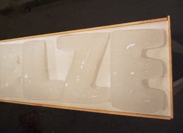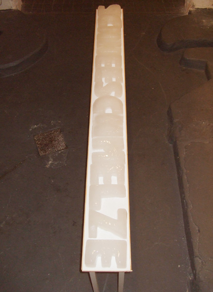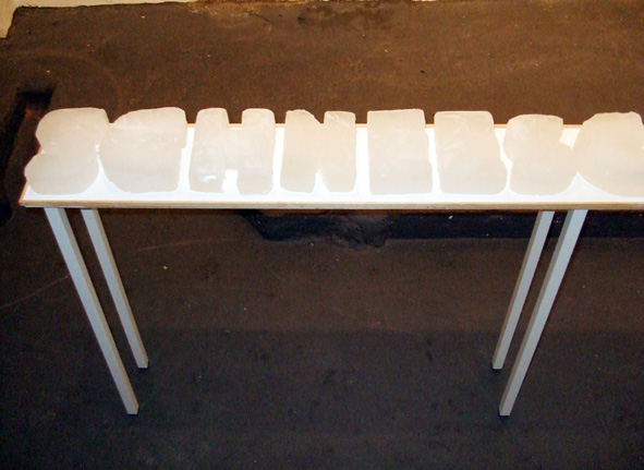 14 Eisbuchstaben schmelzen während der Finissage der "Neuschnee" Ausstellung