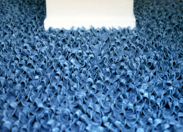 Seifen sind in dünne Streifen geschnitten, die sich beim Schneiden gewellt haben. Diese Streifen sind geichmäßig über eine Bodenfläche verteilt. Von der Nähe betrachtet sehen die Seifenwellen wie eine Wasseroberfläche aus, die sich unter einer Brise kräuselt.