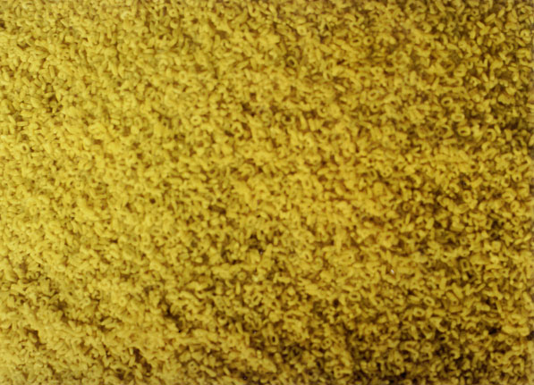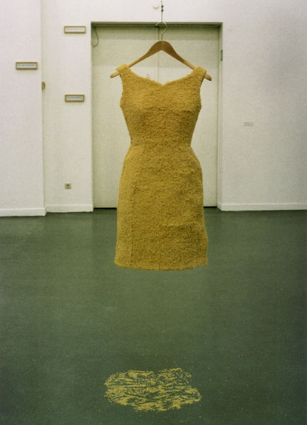 Ein Kleid ist gänzlich aus Buchstabennudeln geformt und hängt frei im Raum auf einem Bügel. Unter dem Kleid auf dem Boden liegen einzelne heruntergefallene Buchstabennudeln.
