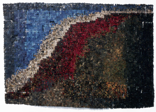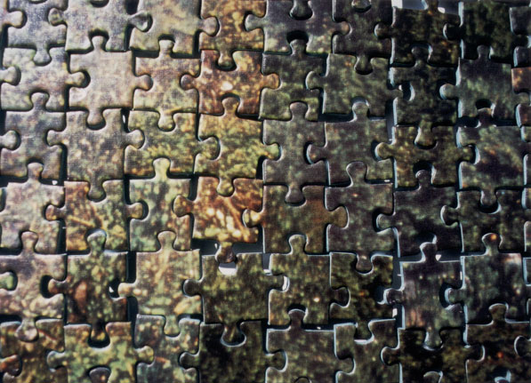 5000teiliges Puzzle mit einem Bergseemotiv ist nicht nach Anweisung, sondern nach Farben sortiert zusammengesetzt. Es entsteht so nicht das angegebene Motiv, sondern ein abstraktes Farbenspiel ohne konkrete Motivdarstellung.