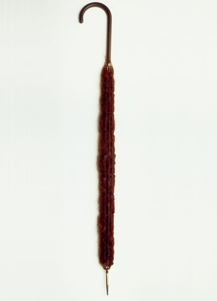 Um das Gerippe eines Regenschirmes sind Haare gewickelt.