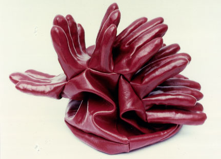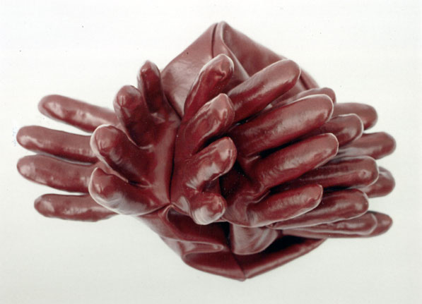 Einzelne Plastikhandschuhe sind zu einem Gesamtobjekt zusammengenäht.
