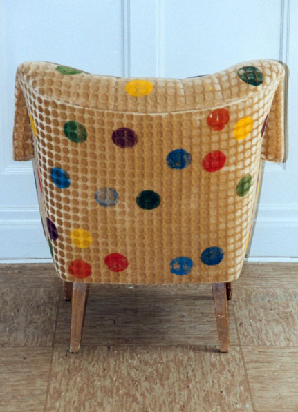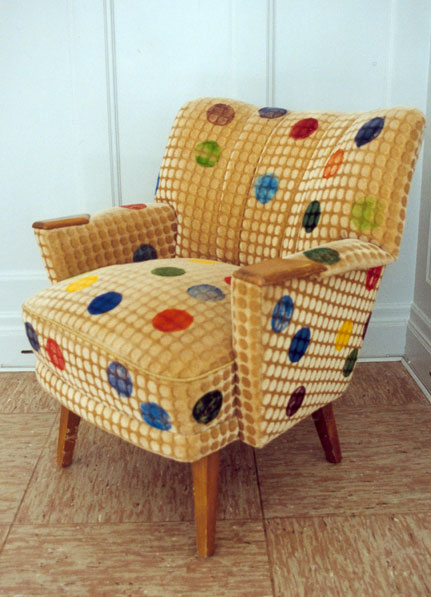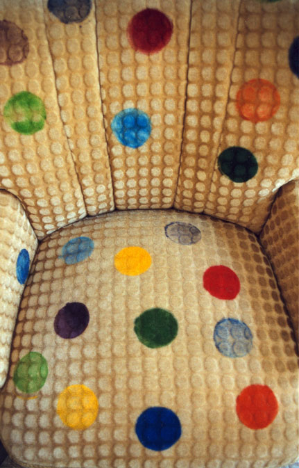 Verschiedenfarbige Farbdosendeckel sind auf den Sesselbezug aufgedruckt.