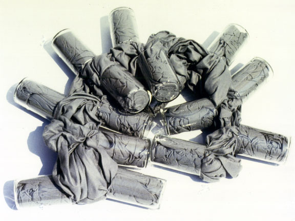 Ein Filzstoff ist so stark in Trinkgläser gestopft, dass die Trinkgläser fest mit dem Stoff verbunden sind und so ein Gesamtobjekt bilden.