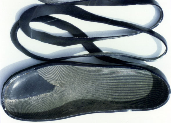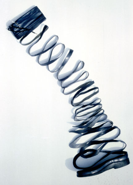 Gummistiefel sind zu spiralförmigen Plastikstreifen zerschnitten. Die Grenzen des ursprünglichen Objektes haben sich in Plastikstreifen aufgelöst, die Gummistiefel als solche sind nur noch schemenhaft erkennbar.