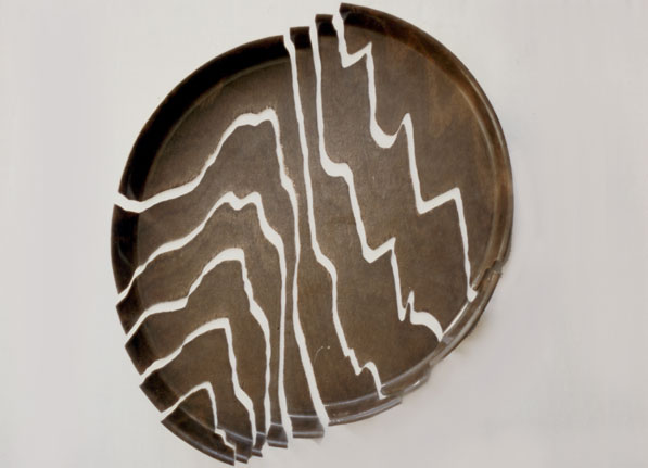 Ein Kellnertablett ist entlang seiner Holzmaserung in Einzelteile geschnitten.