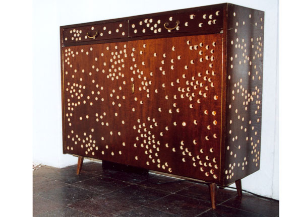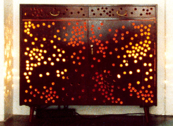 In eine Kommode sind Löcher gebohrt. Von Innen her strahlt Licht durch diese Löcher.