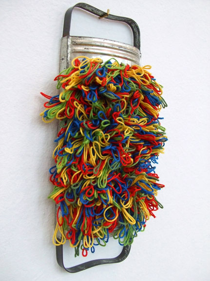 Durch die Loecher einer Kuechenreibe sind verschiedenfarbige Wollfaeden gezogen