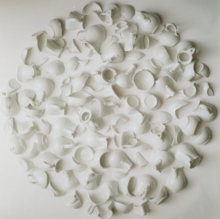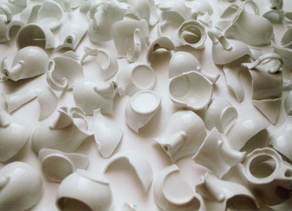 Verschiedene Scherbenformationen eines zerbrochenen Milchkännchengeschirrs sind im Rund angeordnet.