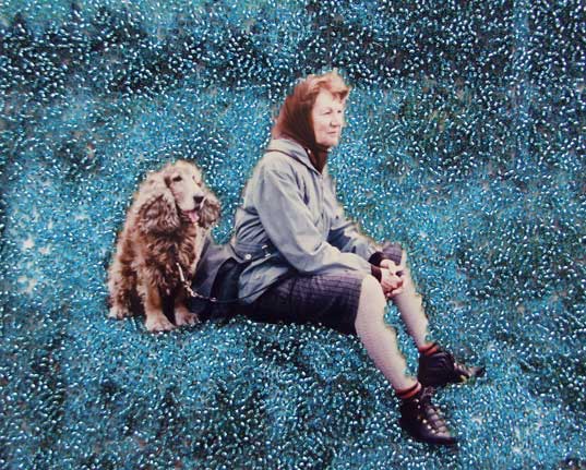 Teile eines Fotos sind mit blauen Perlen überzogen
