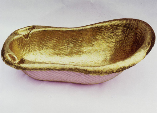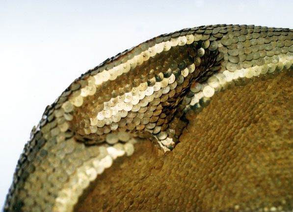 Reißzwecken sind durch eine Plastikbadewanne gesteckt. Innen entsteht so eine schuppenartige Oberfläche, nach außen stehen die Spitzen der Reißzwecken.