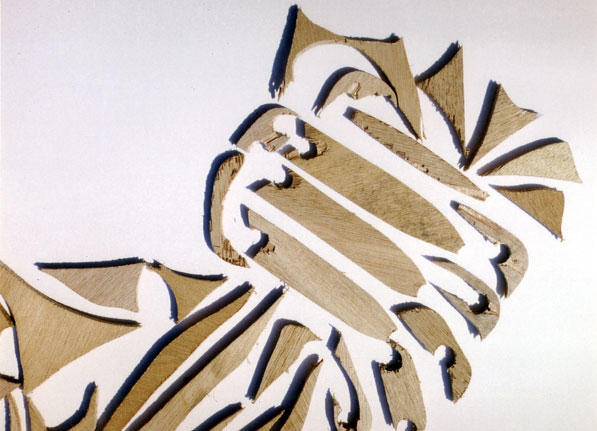 Die Reste einer Holzsaegearbeit sind neu sortiert zusammengelegt