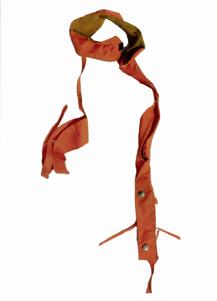 Von einer Jacke sind nur noch Teile der Nähte und Knopfleisten übrig.