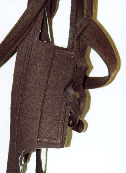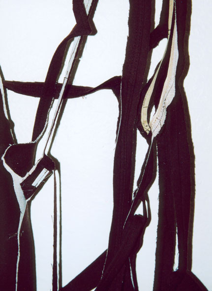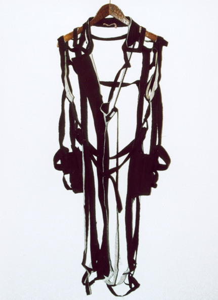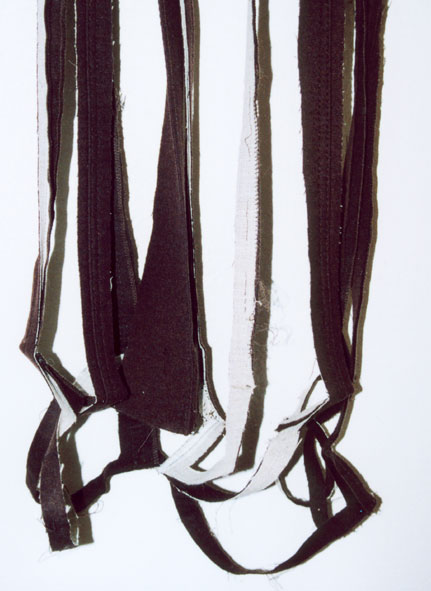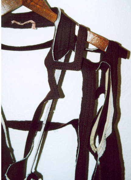 Von einem Mantel sind nur noch Teile der Nähte und Knopfleisten übrig.