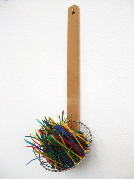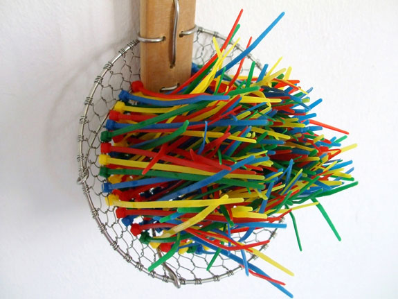 Durch das Sieb eines Schoepfloeffels ist verschiedenfarbiger Kabelbinder gezogen