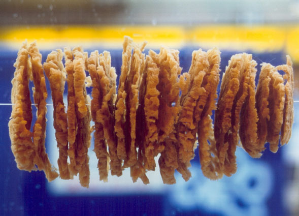 Ein Schwamm ist auseinandergeschnitten. Die auseinandergeschnittenen Einzelteile sind horizontal aufgeschnürt und mit Abstand neu zusammengesetzt.