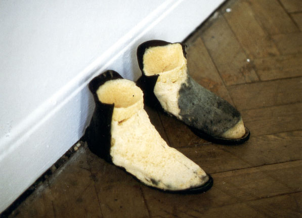 Das Innere von Schuhen ist mit Seife ausgegossen. Nachdem Teile des Schuhleders entfernt sind, tritt an den fehlenden Teilen der Schuhe die riechende wieder erstarrte Seife zum Vorschein.