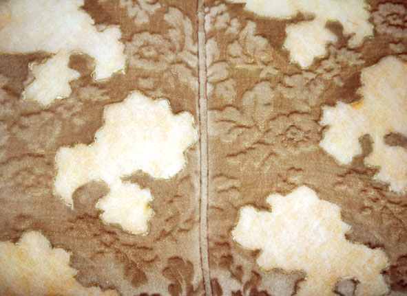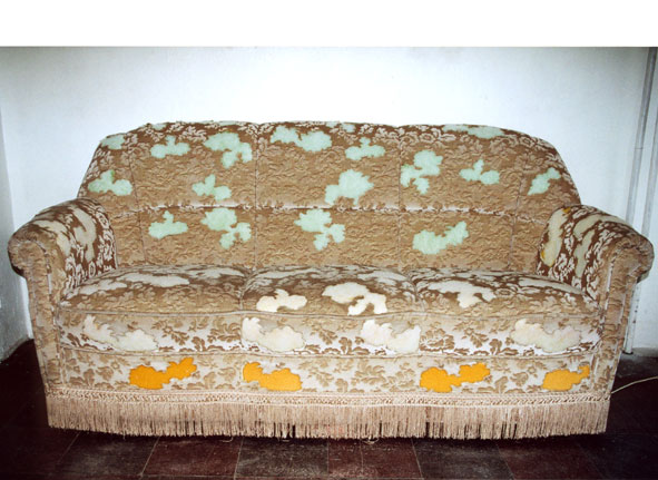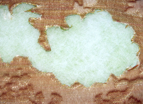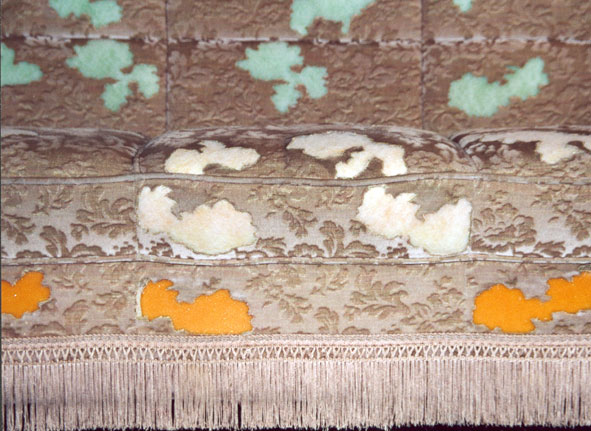 Aus dem Sofabezug sind Blumenfragmente herausgeschnitten. An diesem Stellen tritt das Füllmaterial hervor.