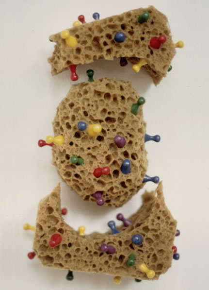 In die natürlich entstandenen Löcher eines Schwammes sind verschiedenfarbige Spielfiguren gesteckt.