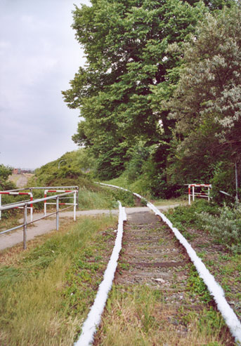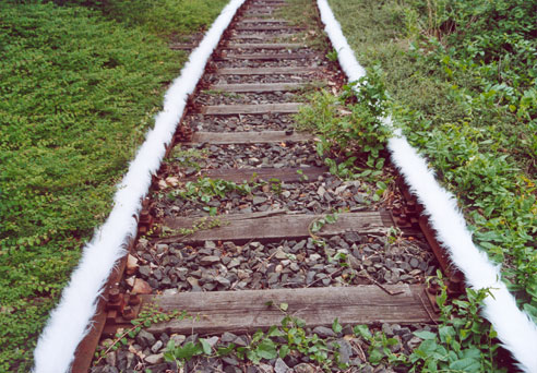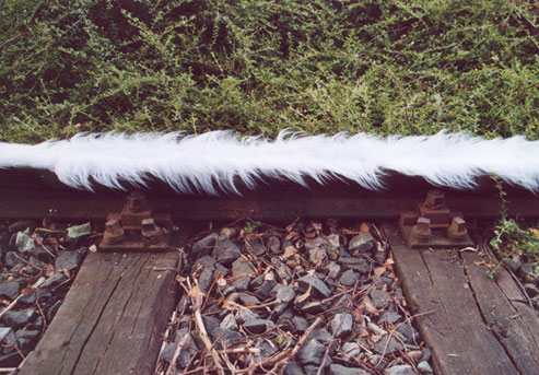 Schon mit Sicht auf den Bahnübergang fallen die ungewohnt weißen Linien der Bahnschienen in der Landschaft auf. Bei näherer Betrachtung sieht der Passant, daß der Schienenstrang am Bahnübergang mit weißem Kunstfell überzogen ist. Bei Berührung fühlen sich die Eisenschienen flauschig an. Es scheint, als habe sich eine besondere Form des Wildwuchses der Schienen bemächtigt - wie der Wildwuchs, der überall an den nicht mehr benutzten Schienen entstanden ist. Das Fell verfremdet das Objekt (die Schienen) und dadurch den Ort, der durch den weißflauschigen Schienenstrang durchzogen wird. Manche Passanten halten inne, um diese überraschende Veränderung begreifen zu wollen. Sie nähern sich damit dem Ort und nehmen ihn durch den "künstlichen" Eingriff bewußt wahr. Gleichzeitig ist das "Kunstwerk" in den Ort integriert, denn obwohl es den Ort optisch verändert hat, beeinträchtigt es die Funktionalität des Bahnüberganges in keiner Weise. |