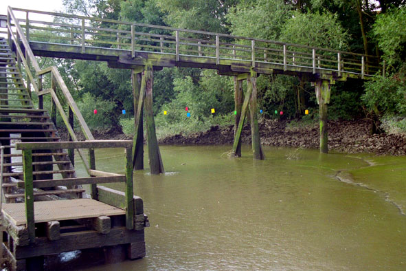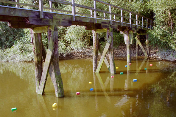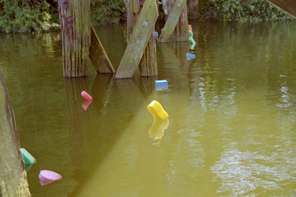 Verschiedene Schwaemme sind mit duennen Nylonfaeden an der Bruecke befestigt. Bei Flut schwimmen die Schwaemme bunt an der Wasseroberflaeche herum und saugen sich mit Elbwasser voll. Wenn der Elbwasserstand sinkt, erhebt sich ein Schwamm nach dem anderen in die Luft, weil die Laenge der Nylonbaender an den Wasserhoechststand bei Flut angepasst sind. Bei Ebbe, wenn das Elbwasser aus dem Hafenbecken abgelaufen ist, haengen die Schwaemme meterhoch über der Schlickflaeche und zeichnen die Wasserstandslinie bei Flut in die Luft. So entsteht ein Spiel zwischen den installierten Schwaemmen und den Gezeiten, ein stetig sich wiederholendes Auf und Ab (Haengen und Schwimmen).