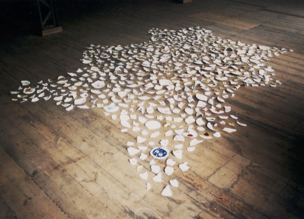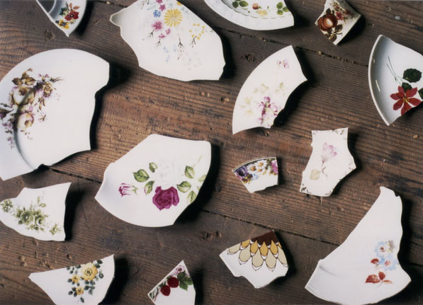 Geschirrscherben mit Blumen- und Pflanzendarstellungen in verschiedenen Darstellungsformen und Größen sind über eine Bodenfläche angeordnet.