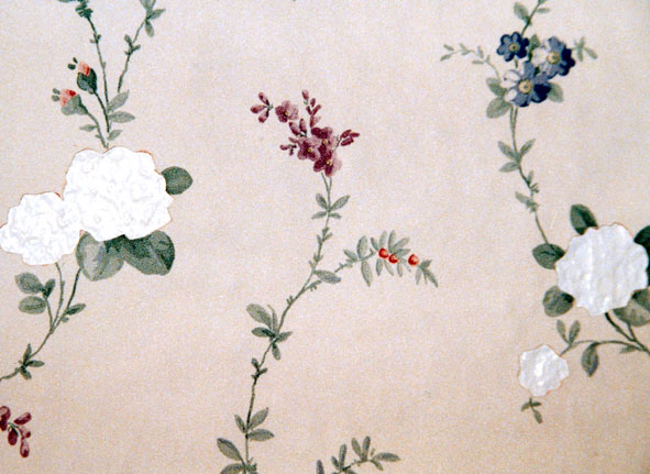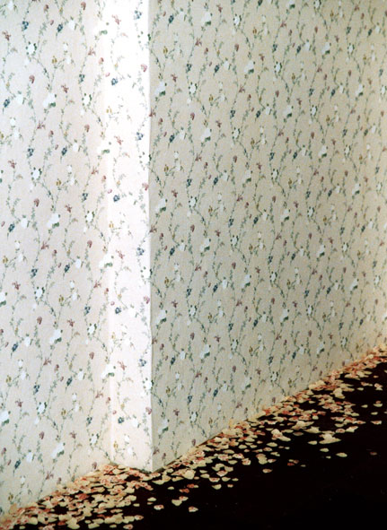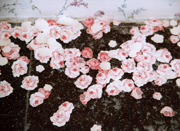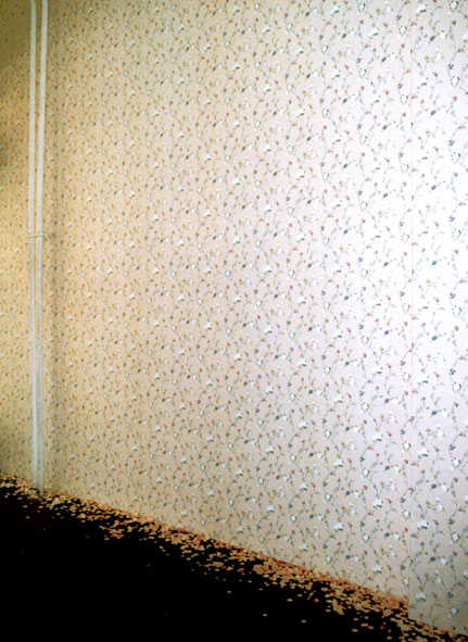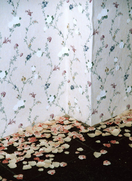 Aus dem Muster einer Tapete sind sämtliche Rosen herausgeschnitten. Die Rosen liegen wie heruntergefallen auf dem Boden vor der tapezierten Wand