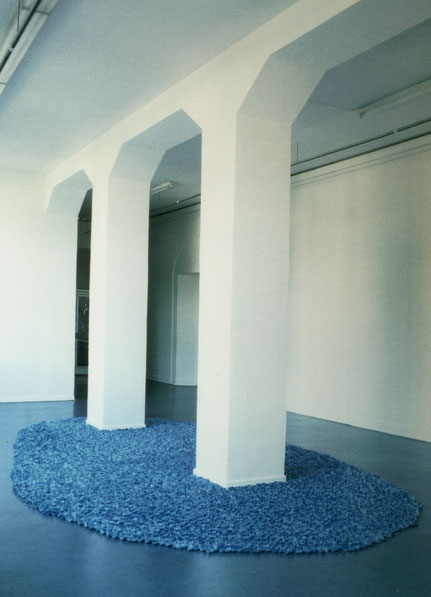 Seifen sind in dünne Streifen geschnitten, die sich beim Schneiden gewellt haben. Diese Streifen sind geichmäßig über eine Bodenfläche verteilt. Von der Nähe betrachtet sehen die Seifenwellen wie eine Wasseroberfläche aus, die sich unter einer Brise kräuselt.