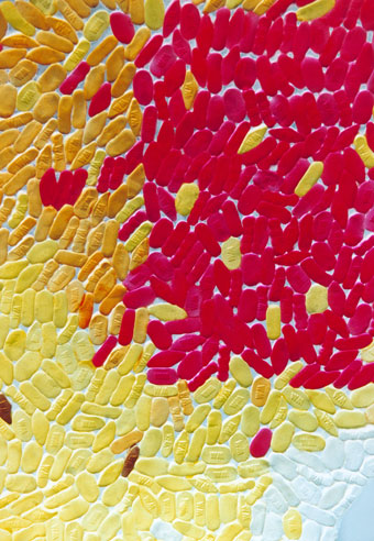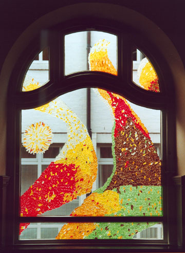 Das Fenster im Ausstellungsraum ist wie ein Kirchenfenster in farbige Formenabschnitte unterteilt, so dass das Licht, das von aussen nach innen faellt (und umgekehrt), farbig gefiltert ist. Im ganzen Raum riecht es nach Weingummi, da die Arbeit nicht aus Glasabschnitten besteht, sondern aus einzelnen Weingummis, die der Farbe nach sortiert auf dem Glasfenster angeordnet sind.