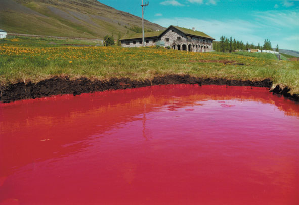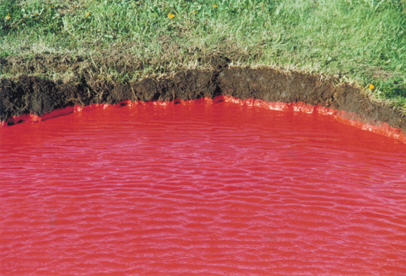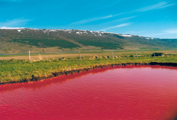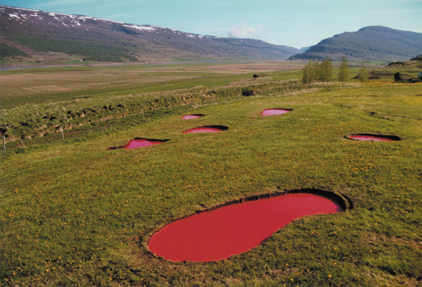 Meine Arbeit "6 rote Pfützen" ist eine Land-art Arbeit. Ich habe einen Teil der das Gunnar Gunnarsson Institut umgebenden Landschaft so verändert, das dieses gewöhnliche Alltagsobjekt Pfütze ungewohnt erscheint. Ich habe 6 Pfützen auf einem abschüssigem Abschnitt des Institutsgeländes angelegt, so daß diese Pfützen auch von weit her gut sichtbar sind. Die Tagesbesucher des Institutes werden so schon vom Haus her auf diese Land-art Arbeit aufmerksam. Bei Herantreten werden sie mit dieser ungewöhnlichen Farbe des Wassers konfrontiert. Sie werden so mit ihrer eigenen Erwartungshaltung und Sehgewohnheit konfrontiert.